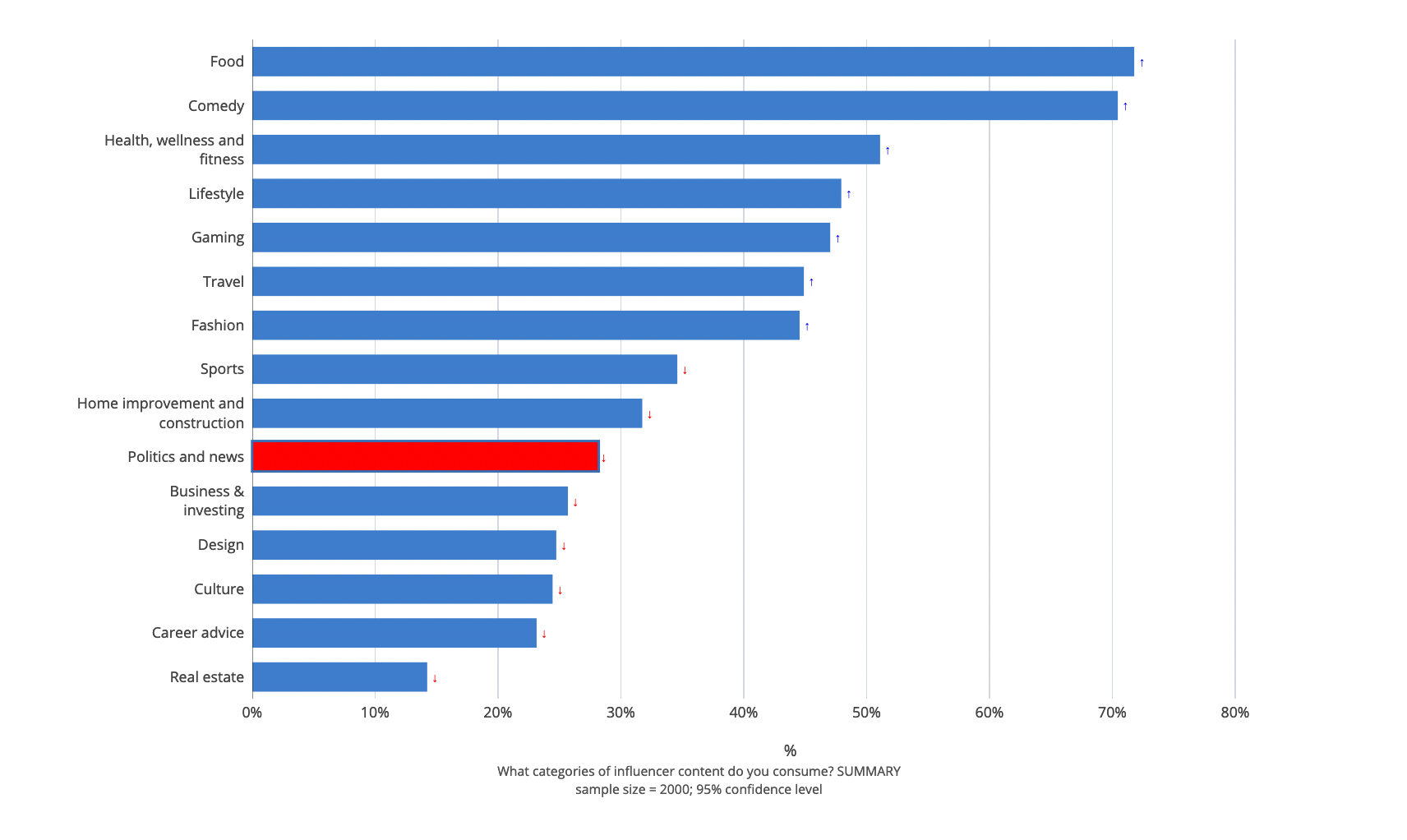 Not surprisingly, young Americans are not on the whole consuming much political content. Comedy and food top the list, while just over a quarter (28%) of 18-35 year olds report consuming political and news content from influencers.