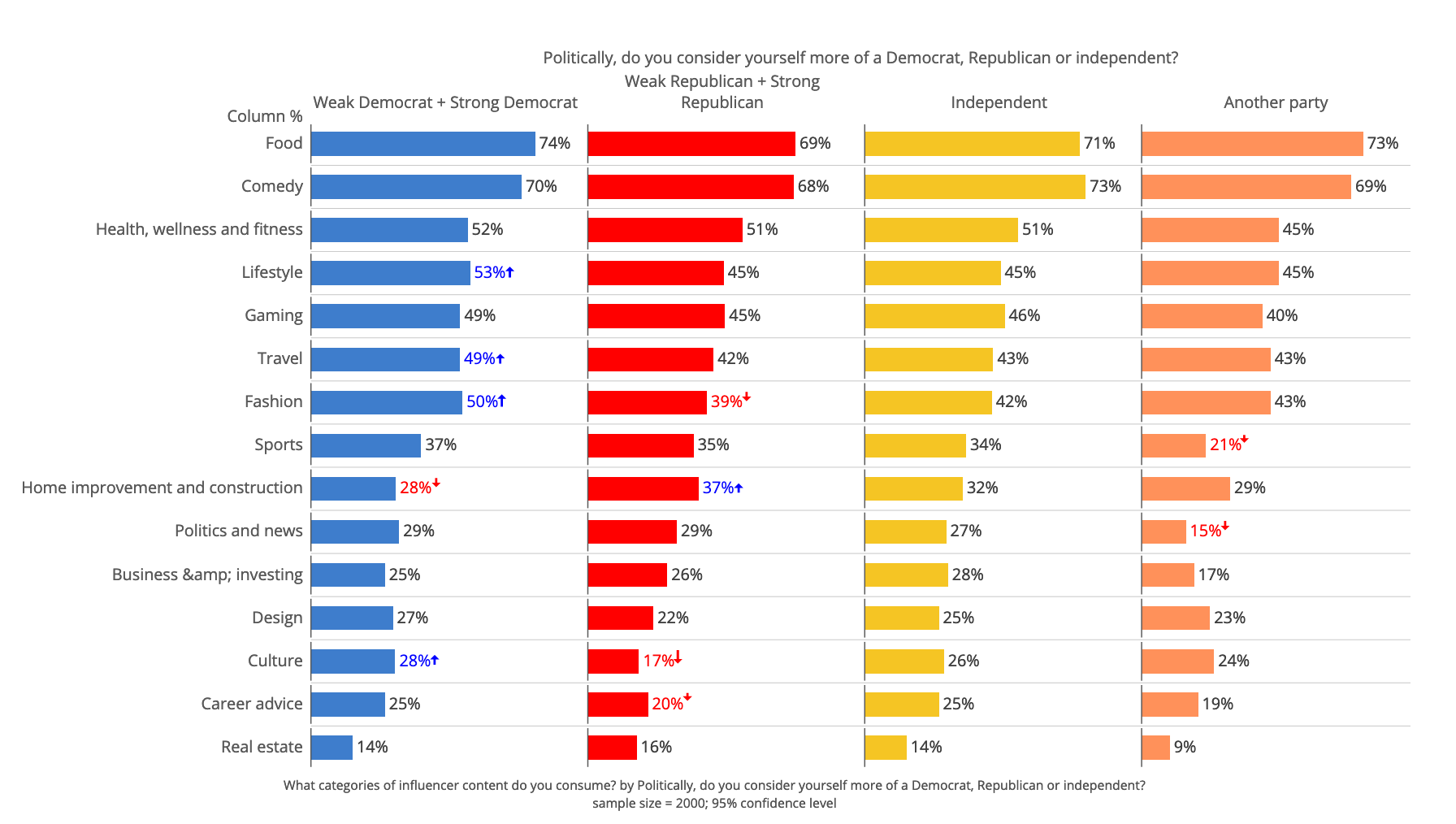 While food and comedy content dominates across party lines, there are subtle differences in the type of content consumed by those who identify as Republicans or Democrats. Most notably, Republicans are slightly more likely to consume content relating to home improvement and construction, while Democrats are more likely to consume fashion, travel, culture and lifestyle content.