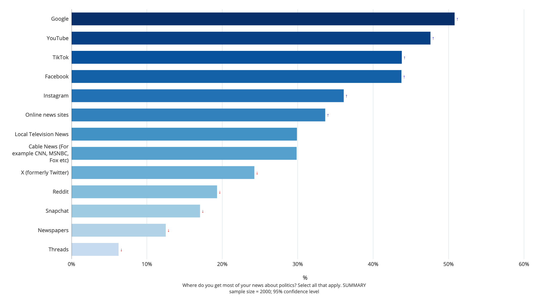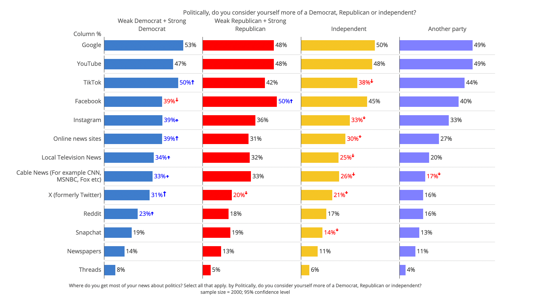 The big platforms--Google, YouTube, Facebook and Instagram--continue to dominate along with TikTok. There are, however, some partisan differences in where young Americans report getting the majority of their political news. Those who identify as Republican and more likely to get their political news on Facebook, followed by those who identify as independent. Those who identify as independent and Republican are notably less likely to get their political news on TikTok than those who identify as Democrats.