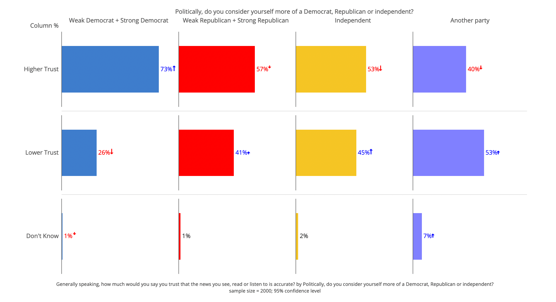 Just 13% of young Americans say they trust the political news they see, while most report feeling having "some" or "a little" trust. There are significant partisan differences, with those who identify as Democrats reporting generally higher trust than those who identify as Republican, independent or something else.